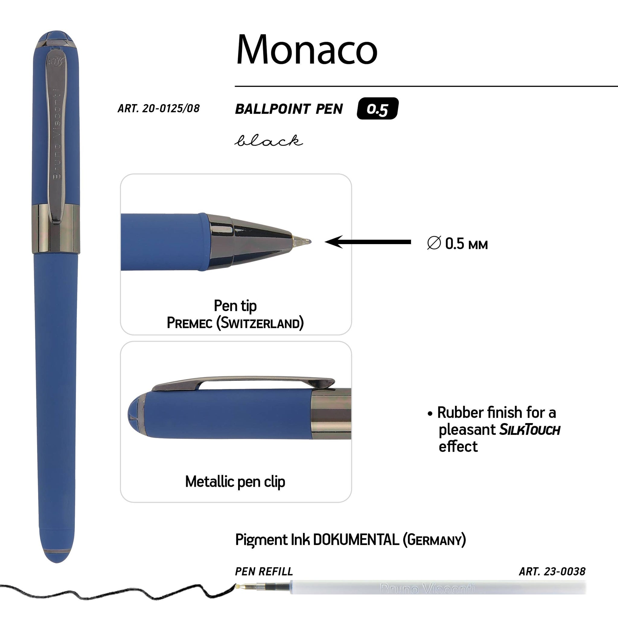 Experience the luxury of the Monaco ballpoint pen with its sleek black ink, fine point, and soft touch grip. The 0.5mm tip and wide body design provide comfort and control, while the accents add a touch of modern elegance.