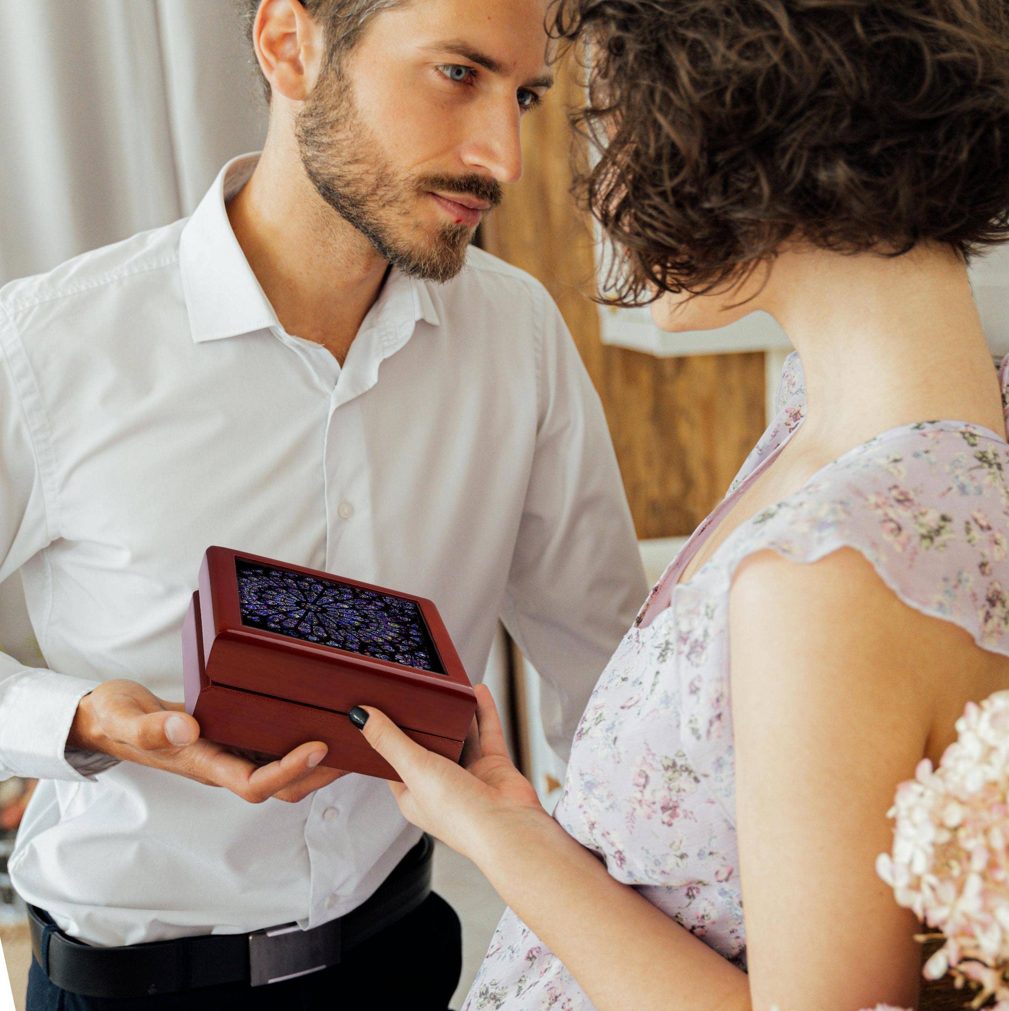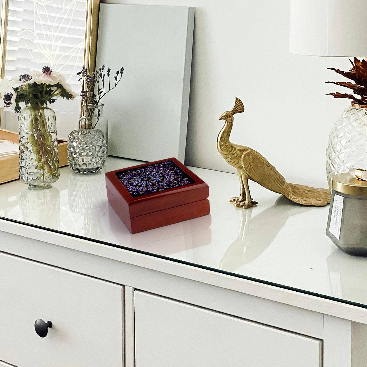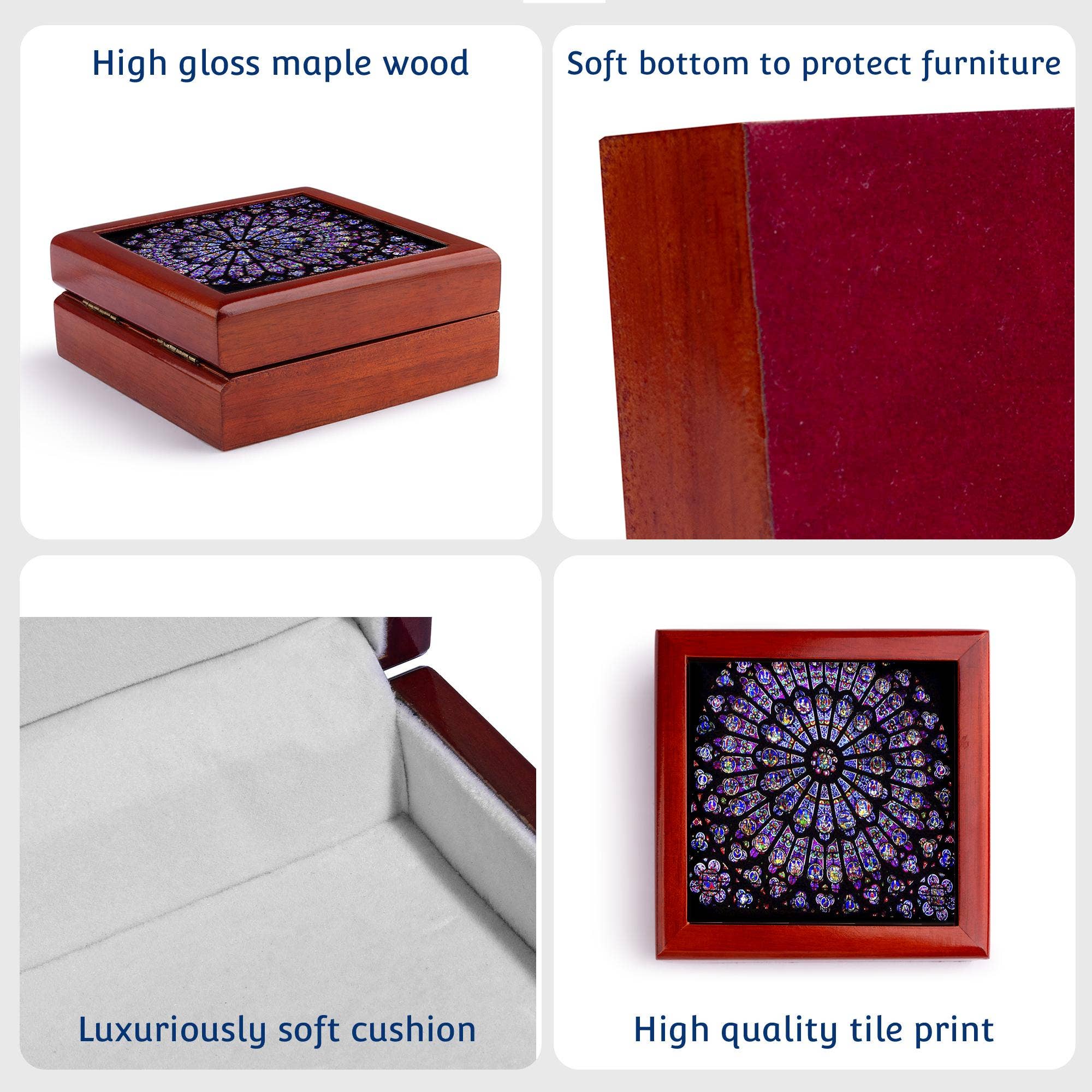The Notre Dame Cathedral Jewelry Box captures its stunning mosaic from the Cathedral in Paris, France. Measuring 5.5x5.5 inches with a 4-inch tile, this elegant organizer boasts a smooth high-gloss finish, secure lid closure, and concealed hinges for effortless opening. Crafted sustainably from eco-friendly materials, it's perfect for storing rings, earrings, letters, or keepsakes. Its plush white velvet interior and soft felt bottom protect your treasures while complementing vintage décor. Ideal as a thoughtful gift, this compact jewelry box combines style, function, and heritage to keep your valuables safe and beautifully displayed. It makes for a cherished gift as well.