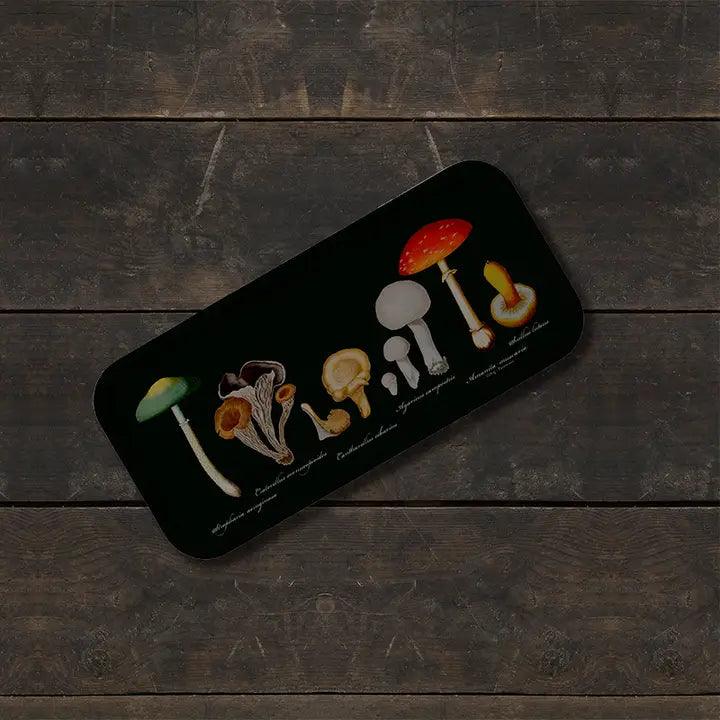 Indulge in the splendor of this European-crafted tray, with its sustainable birch veneer and durable melamine coating. Its captivating mushroom motifs pop against a striking black backdrop, adding an element of charm and confidence to your serving style. Only the finest materials were used in its creation, ensuring the utmost in quality.Use it for spices on the kitchen table or for creams, jewelry and other personal care in the bathroom. It is also great for tea and coffee service and small dishes.