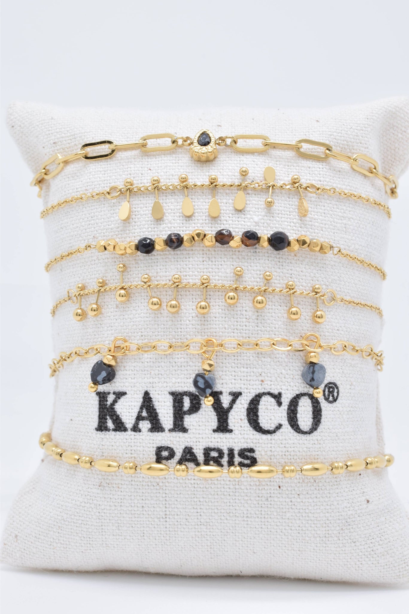* Set of 6 gilded steel bracelets with black agate stones and black crystals * Sold on a plate (without presentation cushion) * Hypoallergenic, this jewelry is water resistant and does not darken