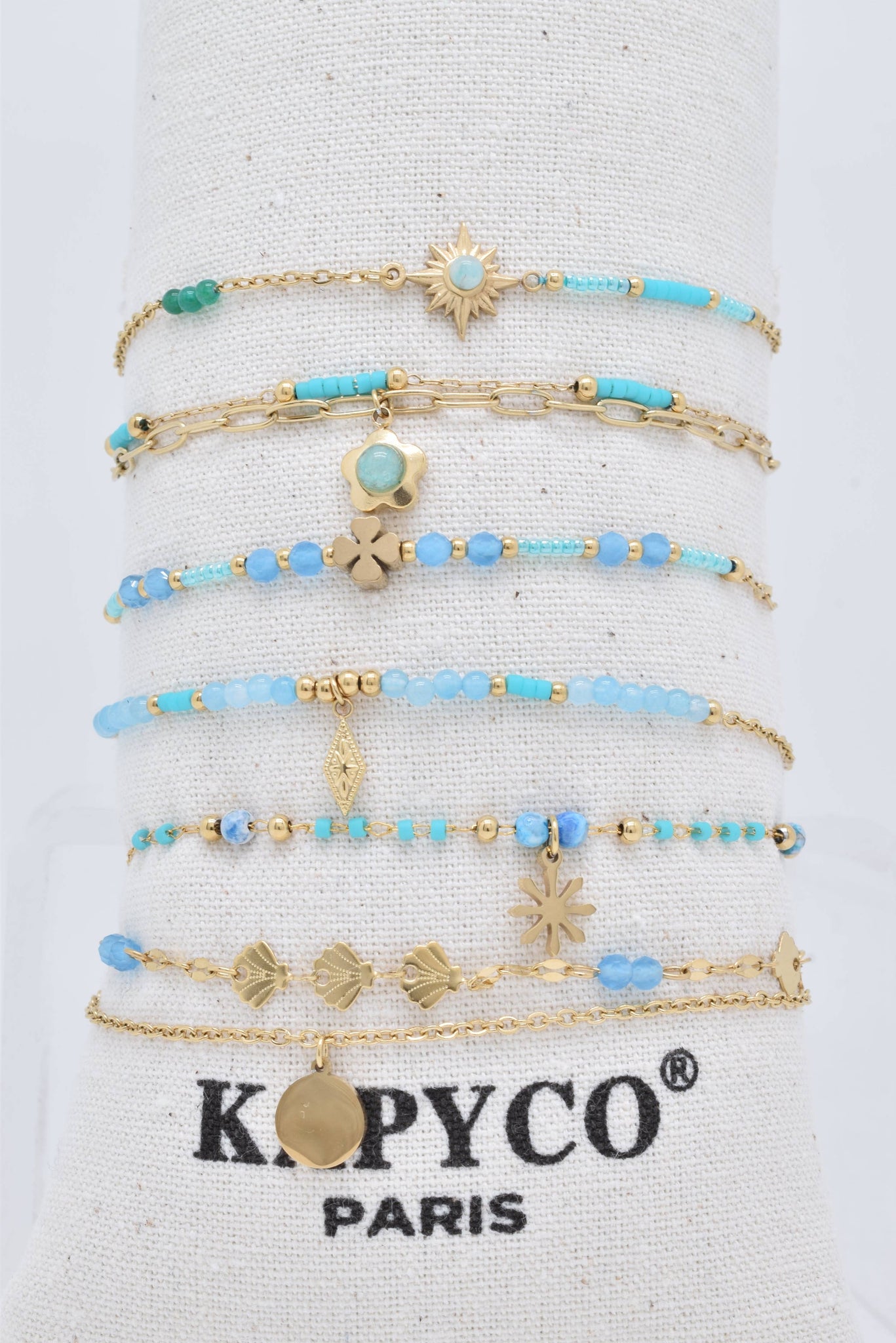 * Set of 6 gold steel bracelets with blue stones and crystals * Sold on a plate (without presentation cushion) * Hypoallergenic, this jewelry is water resistant and does not darken