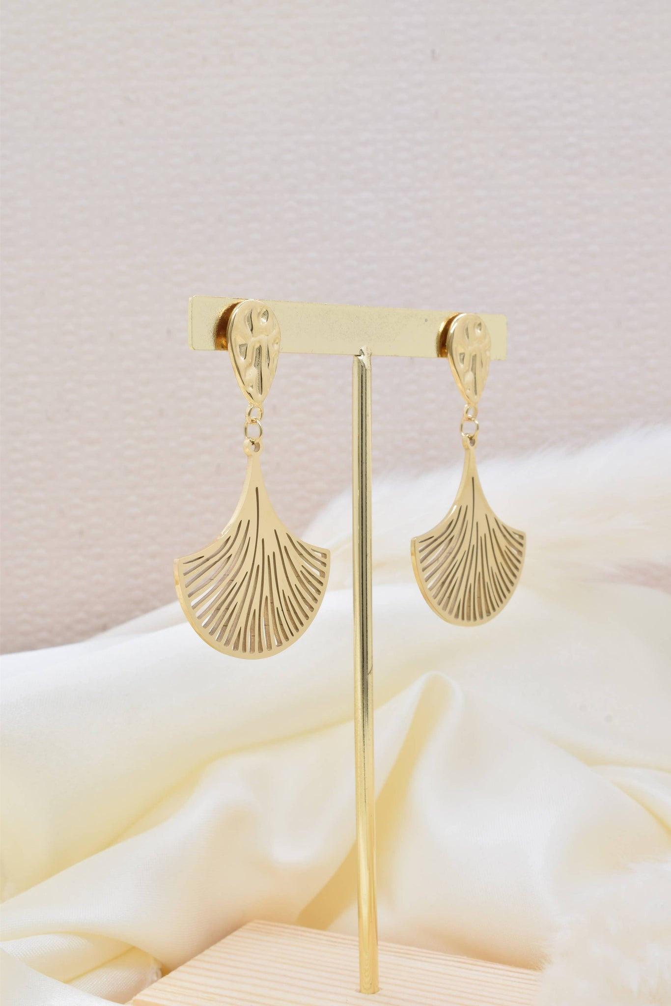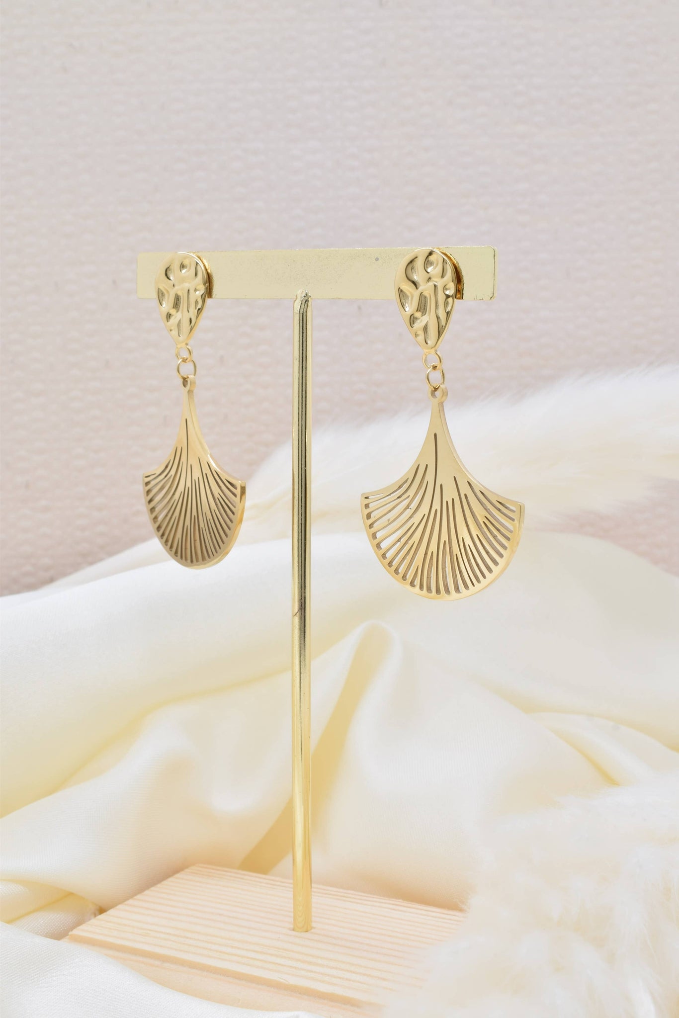 Designed and sold in Paris, these exquisite golden Paris fan earrings with reflect the creative vision of this stainless steel jewelry with its careful and refined design. Rooted in a love for art, design, and sustainability, this collection offers timeless pieces that embody both elegance and resilience. Hypoallergenic and water-resistant, it resists tarnishing, ensuring lasting beauty and strength.