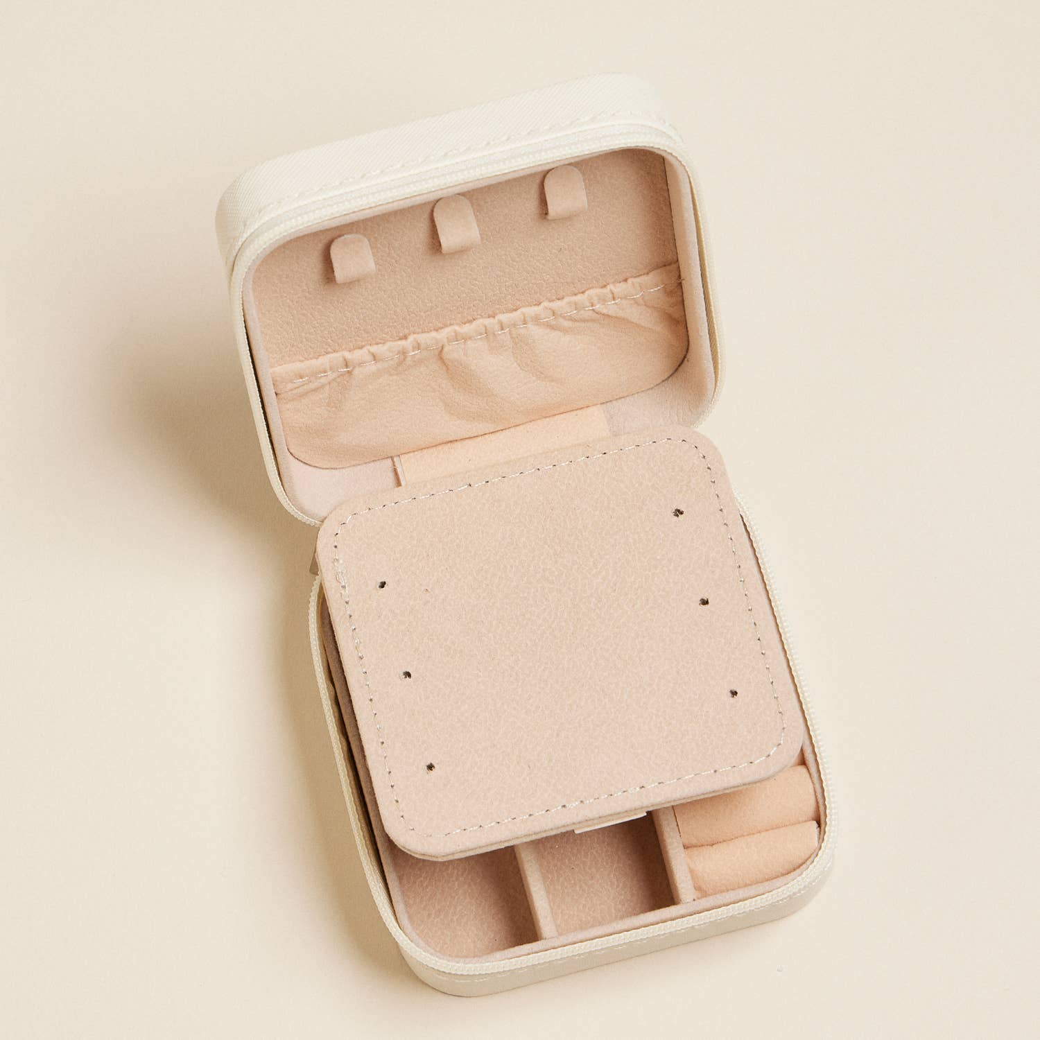 This is a compact square jewelry box with a charming and delicate design. Its exterior features a soft white background adorned with a repeated pattern of light pink bows, arranged in a diagonal grid. The material has a textured finish, giving it a premium feel. The box is secured with a gold-toned zipper and a matching pull tab, adding a touch of elegance. A small handle on the top makes it convenient to carry, making it ideal for travel or everyday use. This jewelry box is perfect for organizing and storing accessories in a stylish way.