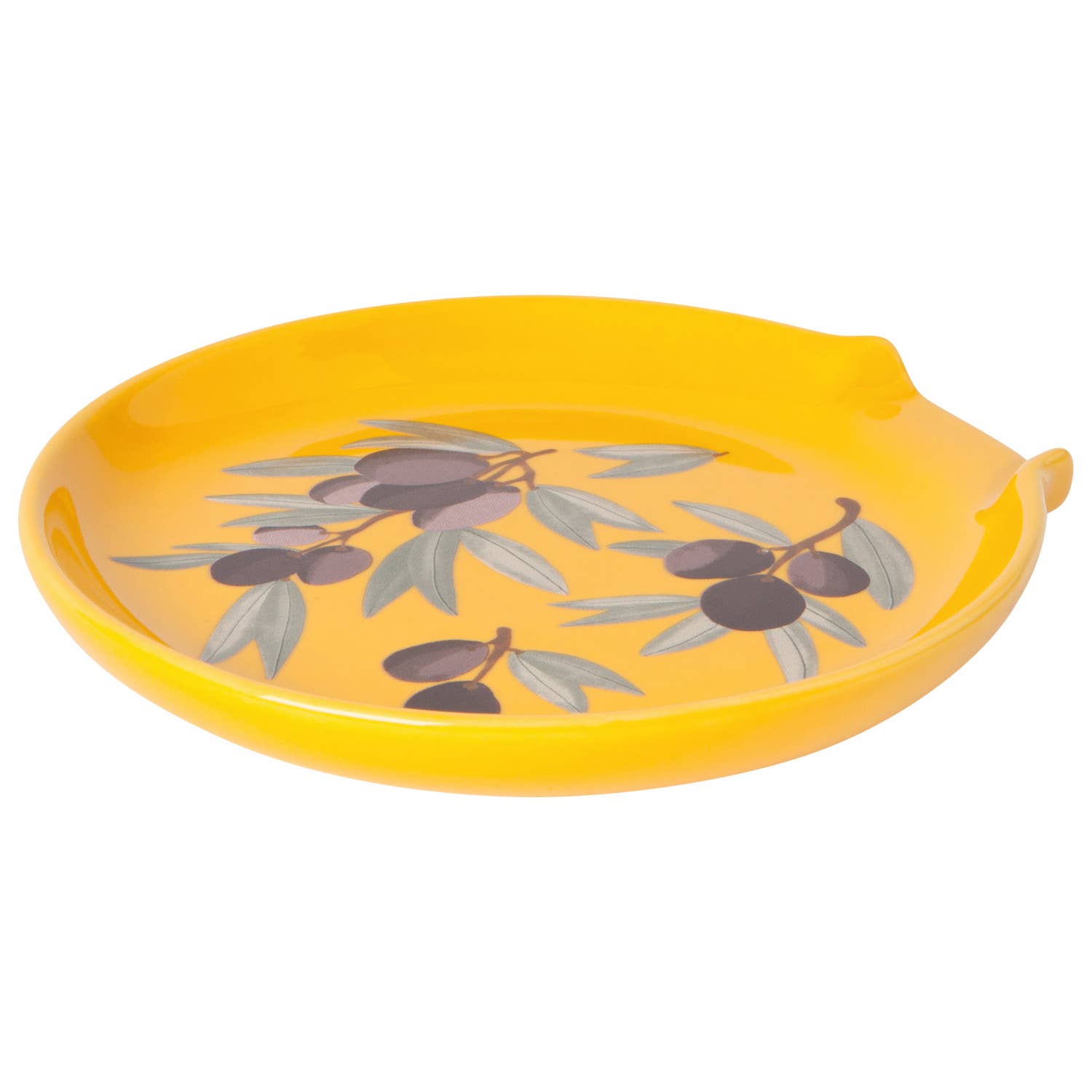 Bring the charm of a vineyard into your kitchen with this gold olive-print spoon rest. Its angled shape catches sauce drips effectively while brightening your space with a cheerful touch. Crafted from sturdy, dishwasher-safe stoneware for lasting use.