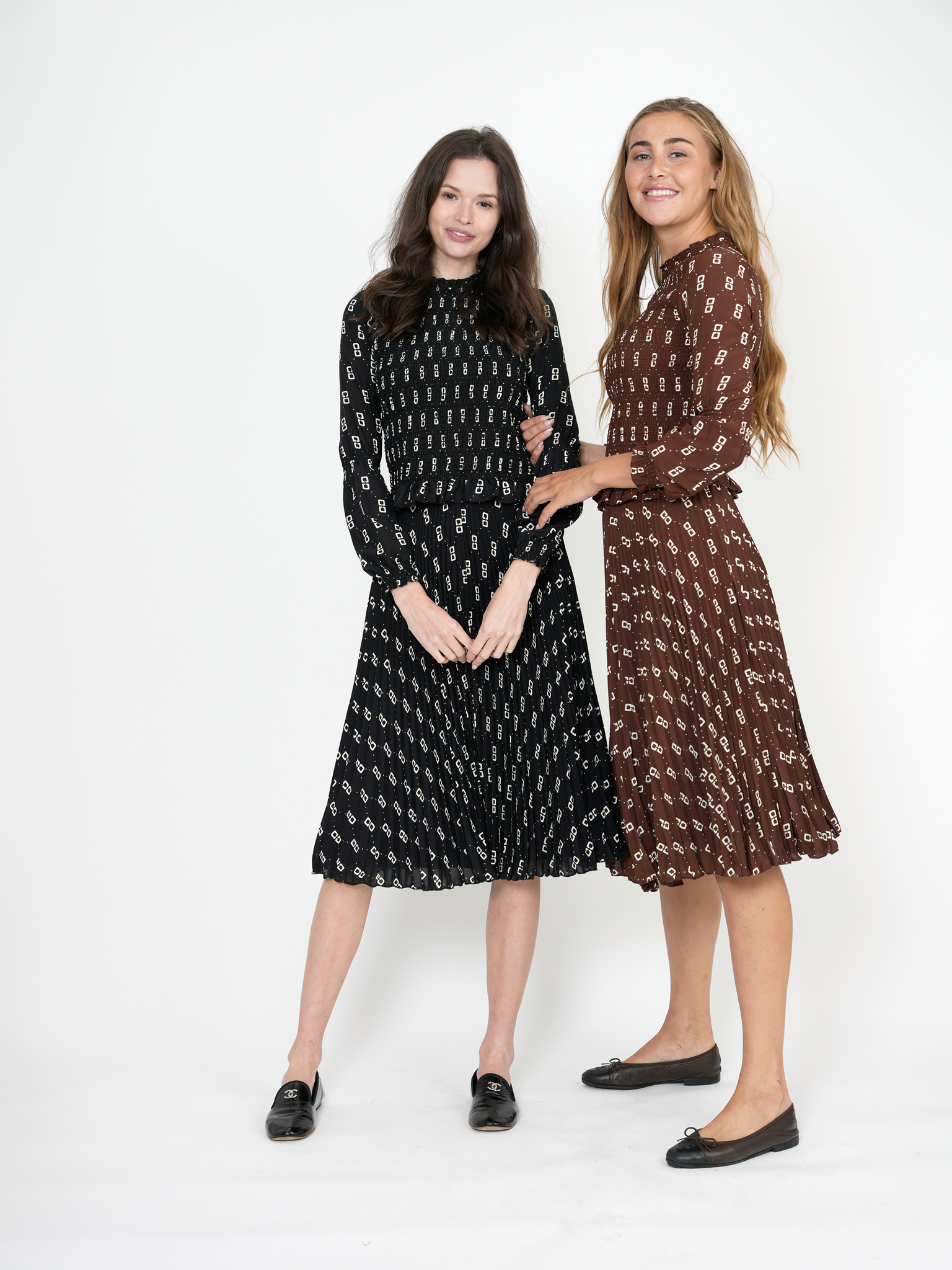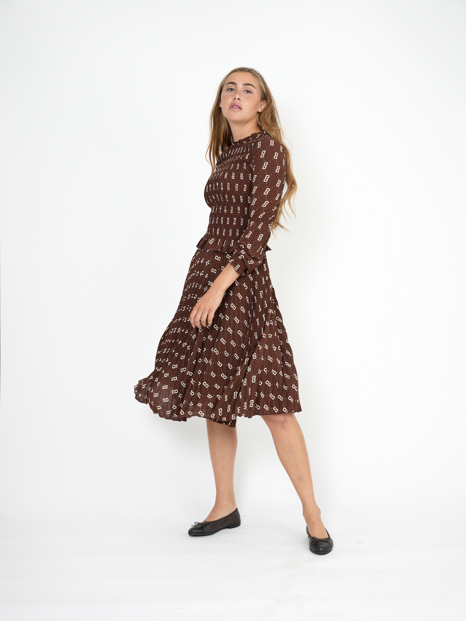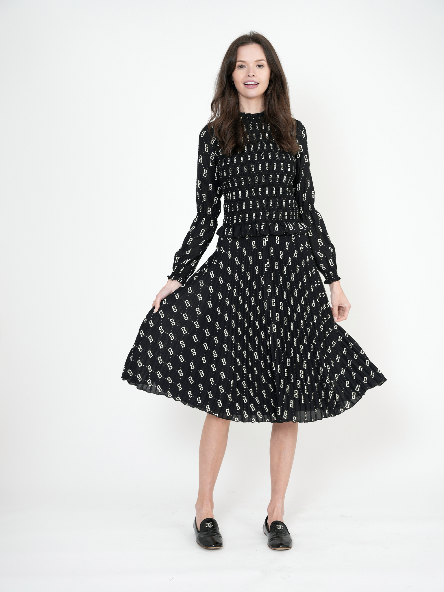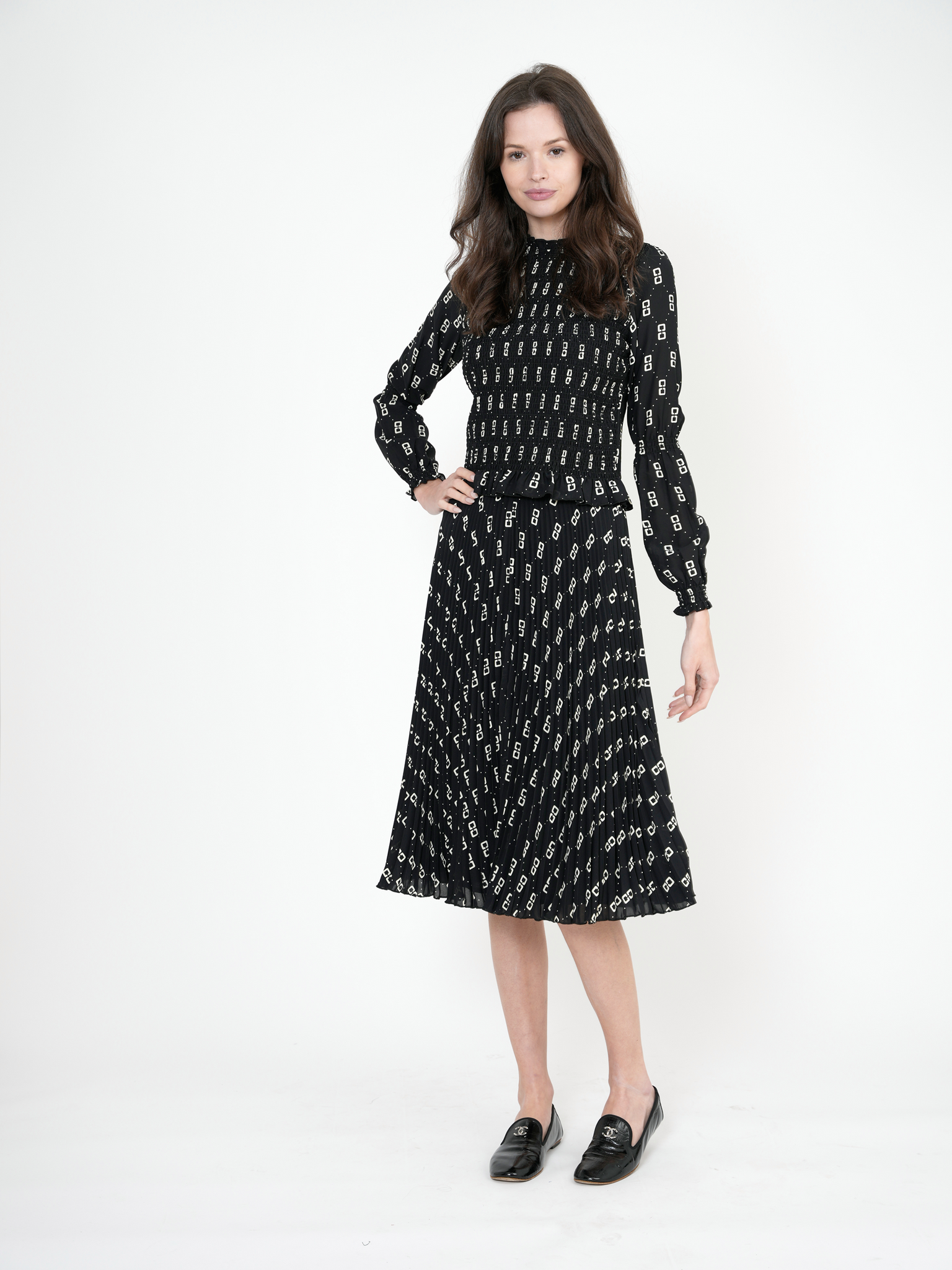 Teen woven hook print 2pc set.Long sleeve top with smock stitch on chest with merrowedge cuffs and hem and back zipper.Matching long skirt with sunburst pleating and back zipperֲAvailable in the following colors: Black Chocolate Composition: 100% Polyester WovenWashing Instructions: MACHINE WASH COLD, INSIDE OUT, NO CHLORINE BLEACH, HANG TO DRY