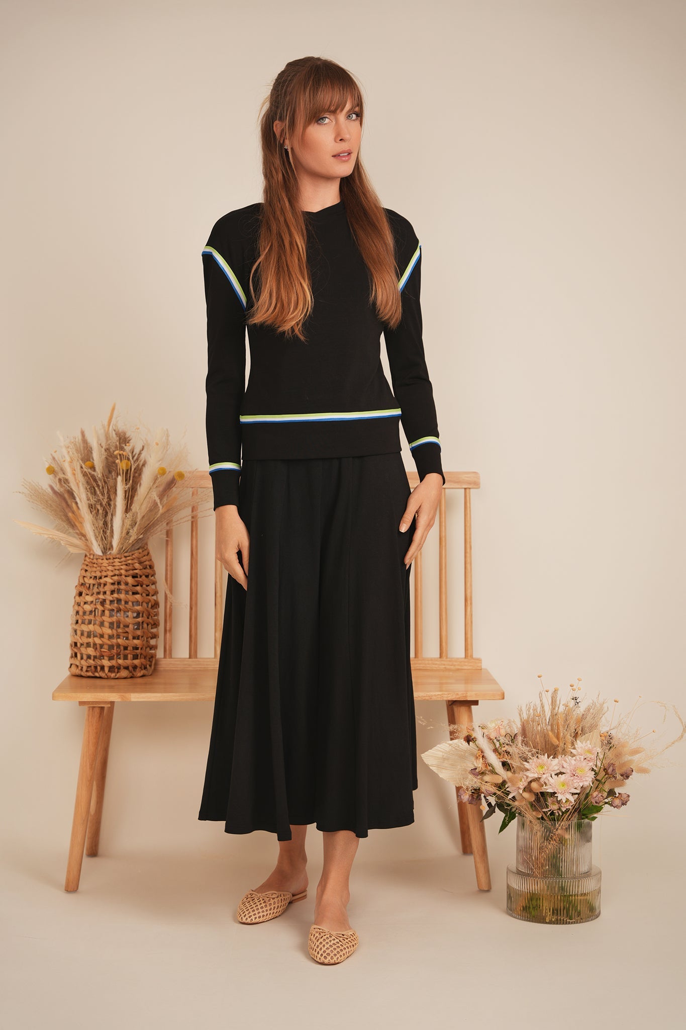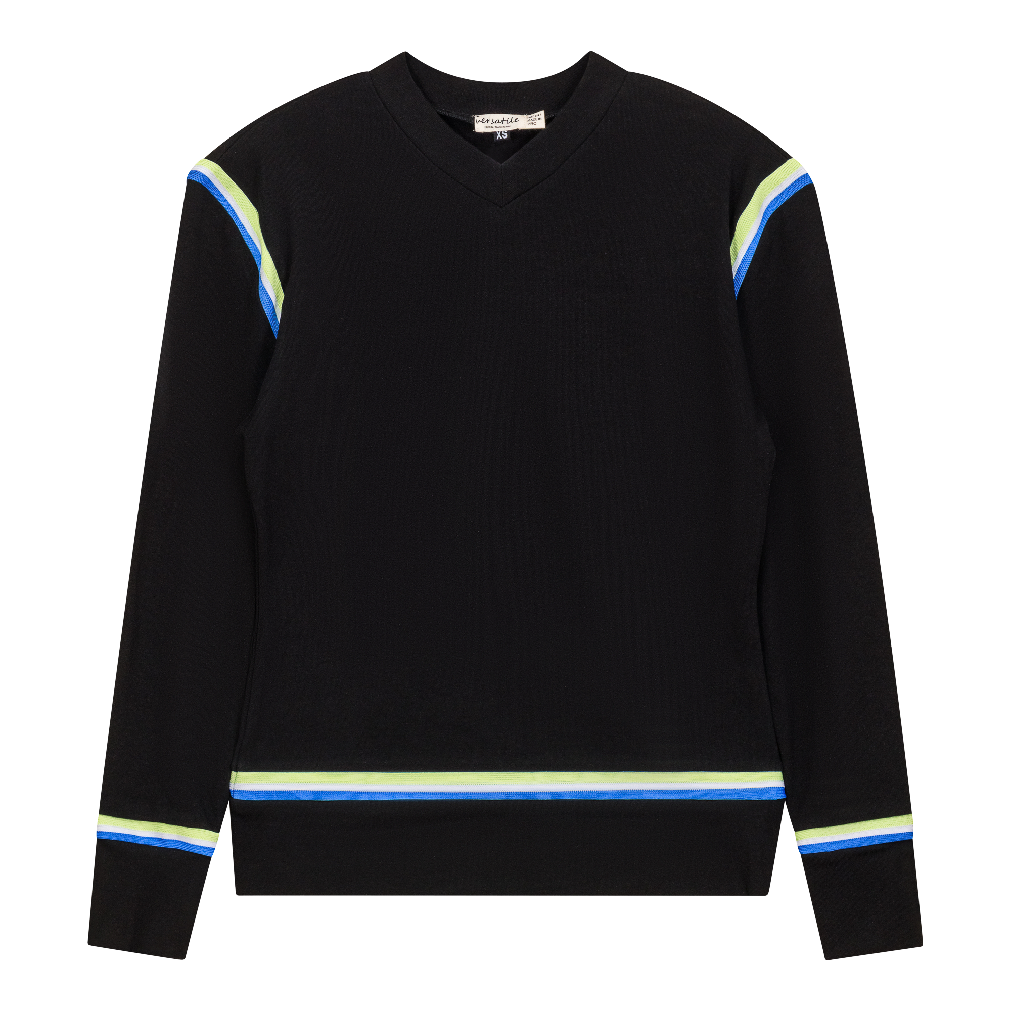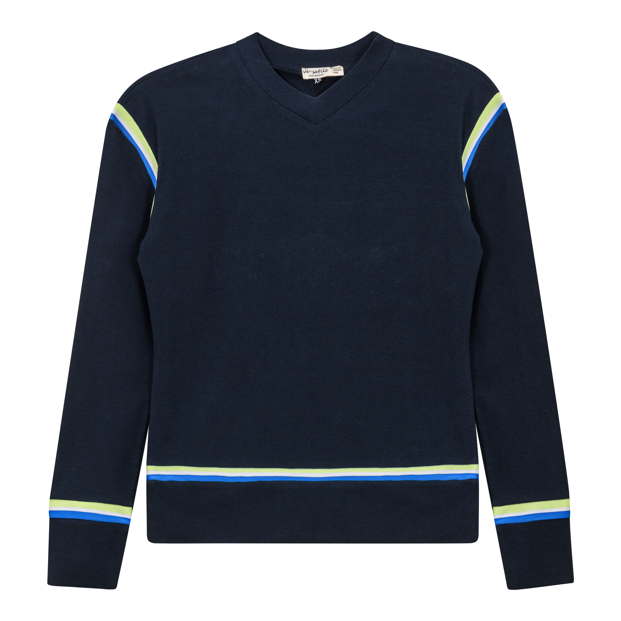 Ladies long sleeve v neck contrast striped top. ֲAvailable in the following colors: White Dark Denim Black Composition: 95% Cotton 5% Spandex KnitWashing Instructions: MACHINE WASH COLD, INSIDE OUT, NO CHLORINE BLEACH, TUMBLE DRY LOW