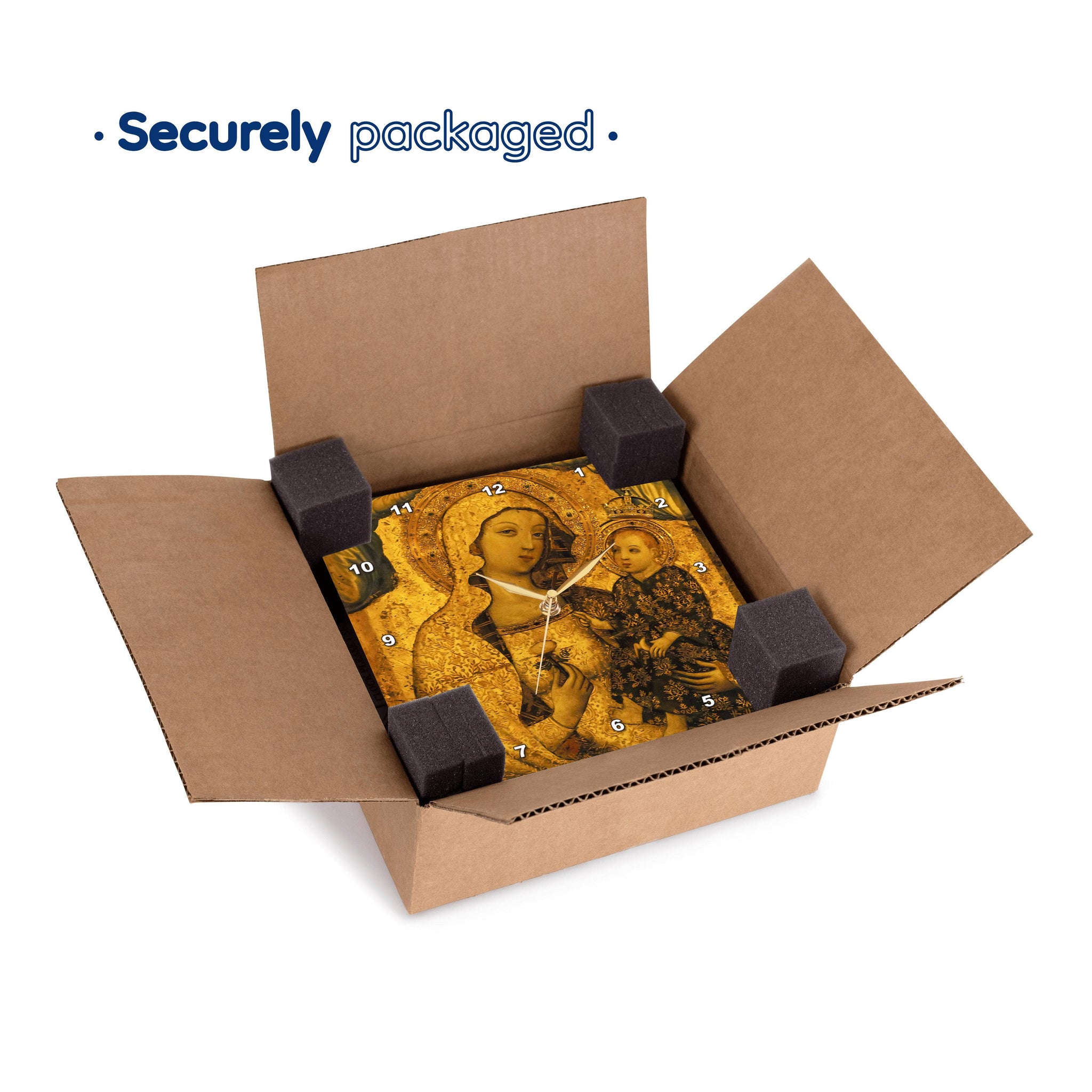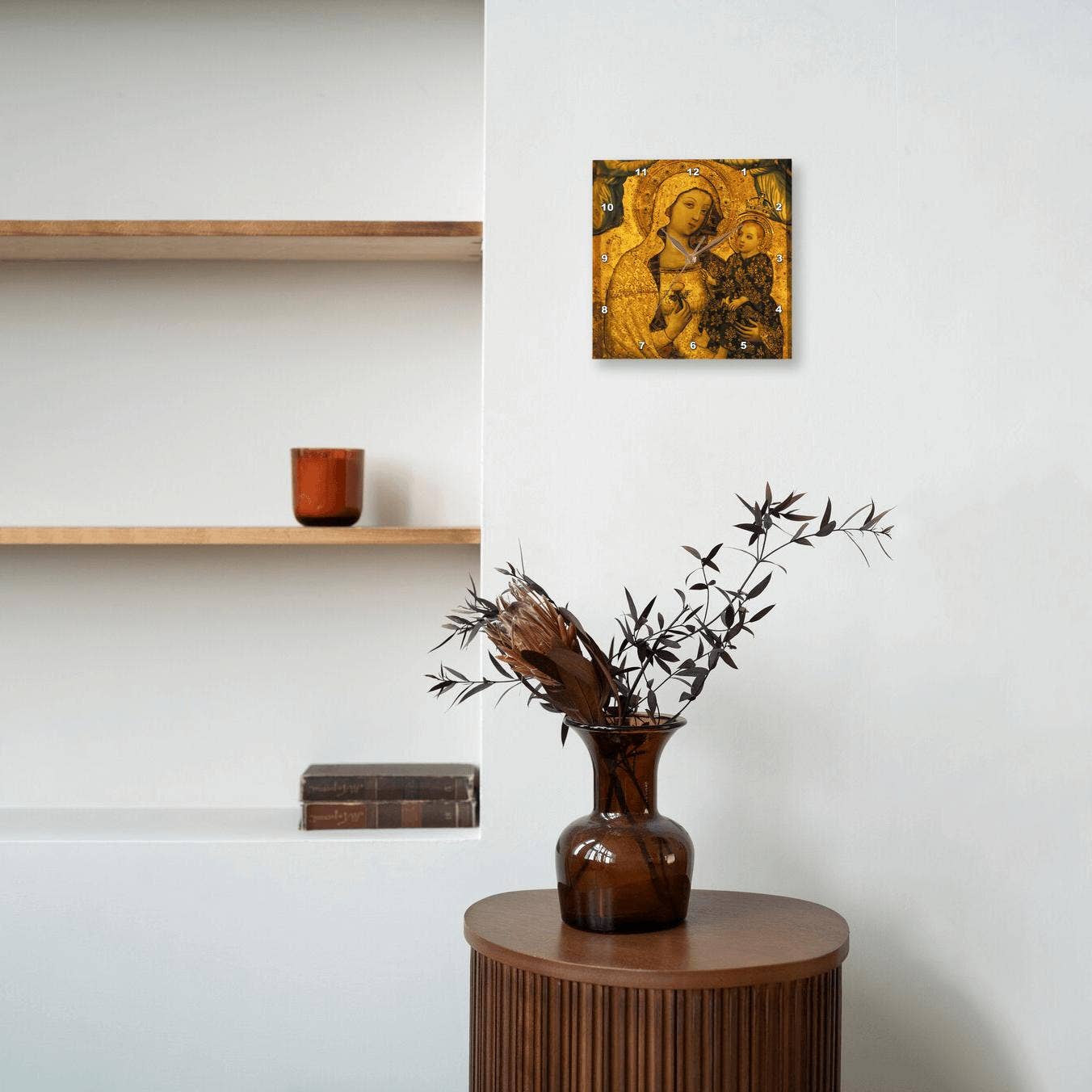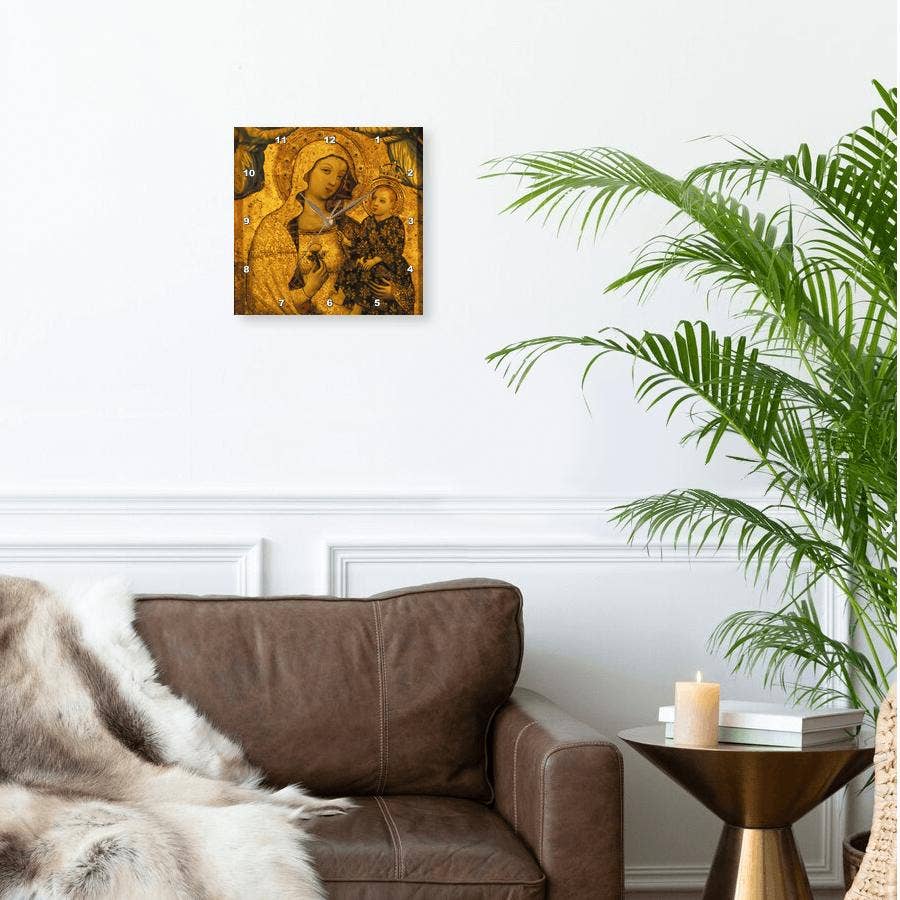 Enhance any room in your home or office with this striking large picture wall clock featuring the Ancient Virgin Mary painting from Seville Cathedral, Andalusia, Spain. This unique clock combines art with function. The white numbers outlined in black are easy to read, while the durable high-grade aluminum construction withstands moist environments like covered patios. Its quiet, battery-operated quartz movement ensures no ticking sound, making it ideal for rooms of all ages. This clock requires one AA battery (not included) and makes a thoughtful and distinctive gift.