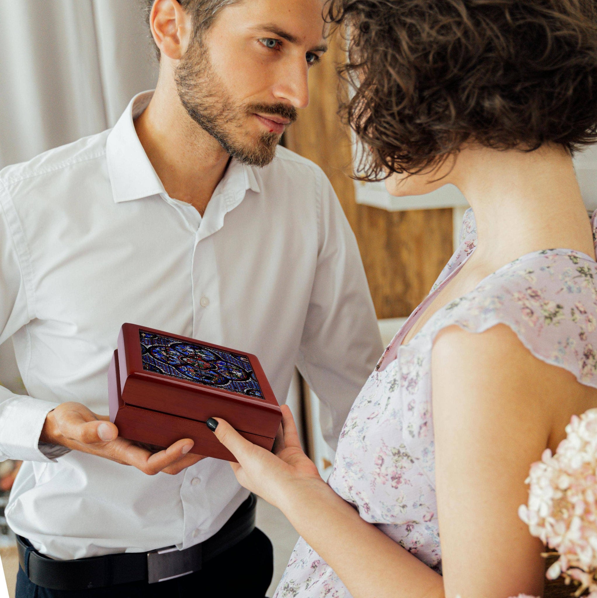 This jewelry box captures a stunning stained glass mosaic in the Chartres Cathedral. Measuring 5.5x5.5 inches with a 4-inch tile, this elegant organizer boasts a smooth high-gloss finish, secure lid closure, and concealed hinges for effortless opening. Crafted sustainably from eco-friendly materials, it's perfect for storing rings, earrings, letters, or keepsakes. Its plush white velvet interior and soft felt bottom protect your treasures while complementing vintage décor. Ideal as a thoughtful gift, this compact jewelry box combines style, function, and heritage to keep your valuables safe and beautifully displayed. It makes for a cherished gift as well.