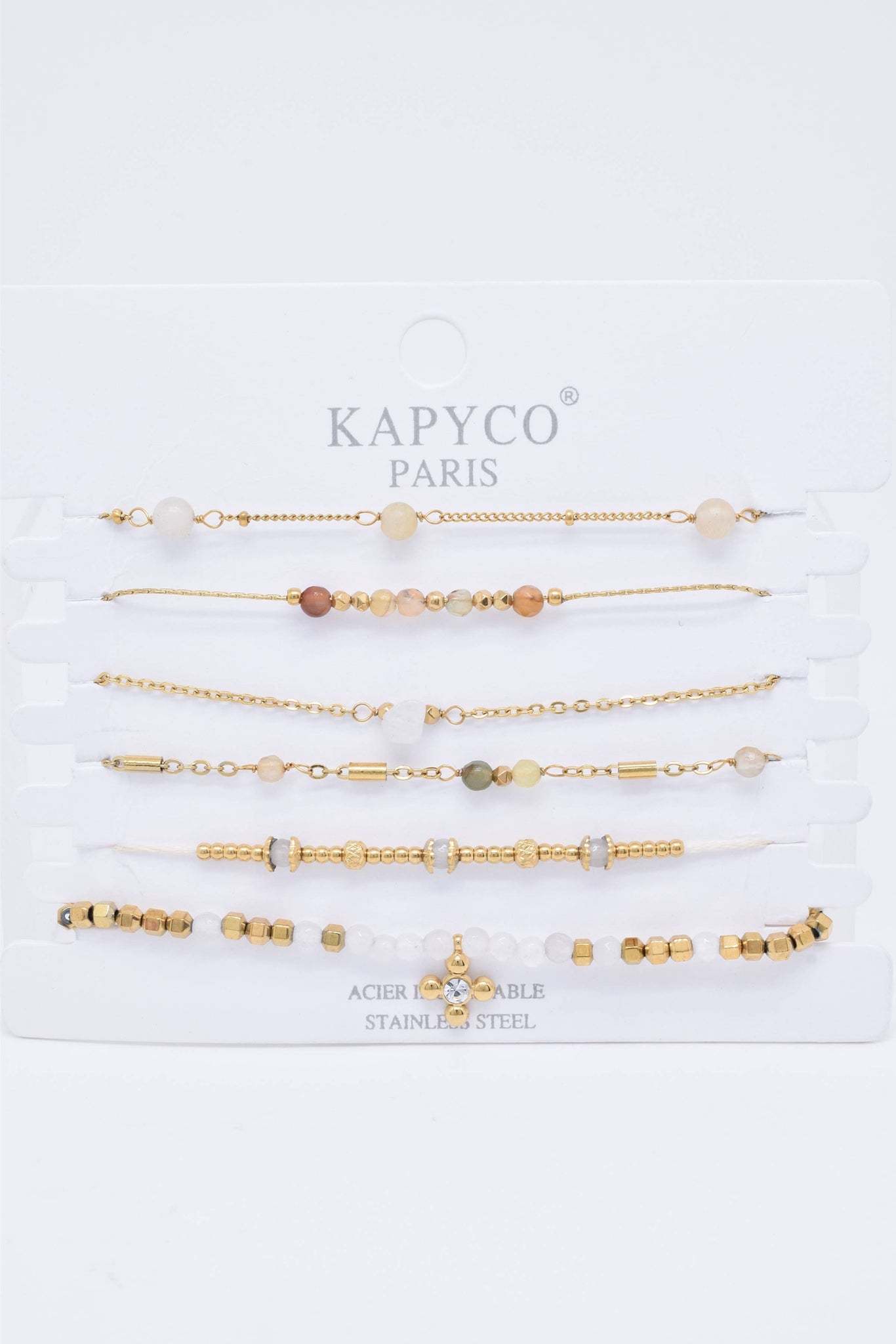 Designed and sold in Paris, this set of 6 gilded steel bracelets with natural stones reflects the creative vision of this stainless steel jewelry without its careful and refined design. Rooted in a love for art, design, and sustainability, this collection offers timeless pieces that embody both elegance and resilience. Hypoallergenic and water-resistant, it resists tarnishing, ensuring lasting beauty and strength. * Sold (without presentation cushion)